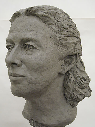 She wastes no time getting started, grabbing handfuls of terracotta clay and applying it to her small scaffold. She’s rolled up her sleeves and tied her hair back but disobedient blonde wisps explode from Marianne’s head like capering flames. Working quickly, her fingers dance in the clay that glows darkly against her pale skin. She is at one with the material.