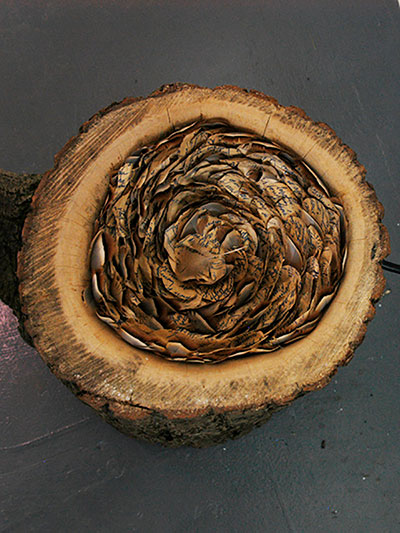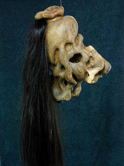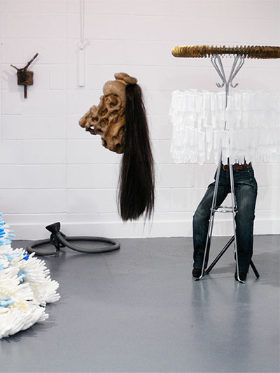 She welcomes me inside, out of the chucking spring rain and into her unpretentious studio. She’s recently transformed the space, ripping out the old carpeting, applying a coat of white emulsion to the walls and frequenting eBay to sell the needless items that had been stored in here. Only an unsold unemployed glass shower door remains leaning against one wall. Blackened wooden floorboards are splattered with paint and clay dust. Five head-shaped figures wrapped in plastic bags of various colours – works in progress – sit on a table next to the storage bins overflowing with sculpting supplies. There is a radio on the mantle next to one of Marianne’s earlier pieces representing the legend of Sedna, the Inuit sea goddess whose fingers begat ocean creatures. In the centre of the room, her stage: a swivelling platform atop which sits an upright dowel – a wooden stick – with a paper ball on top, all wrapped in plastic. That will be the root of me, I presume.