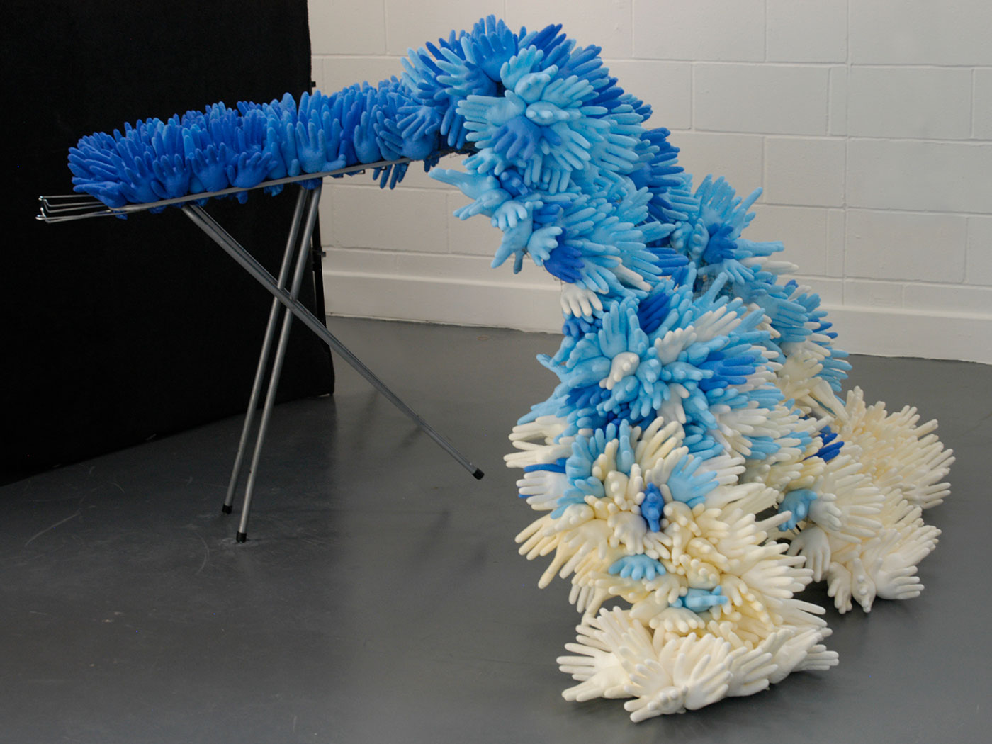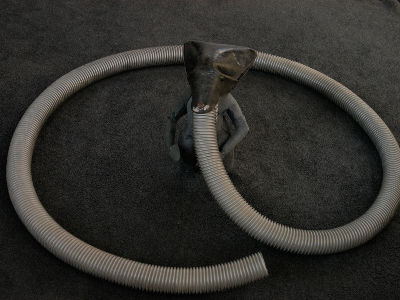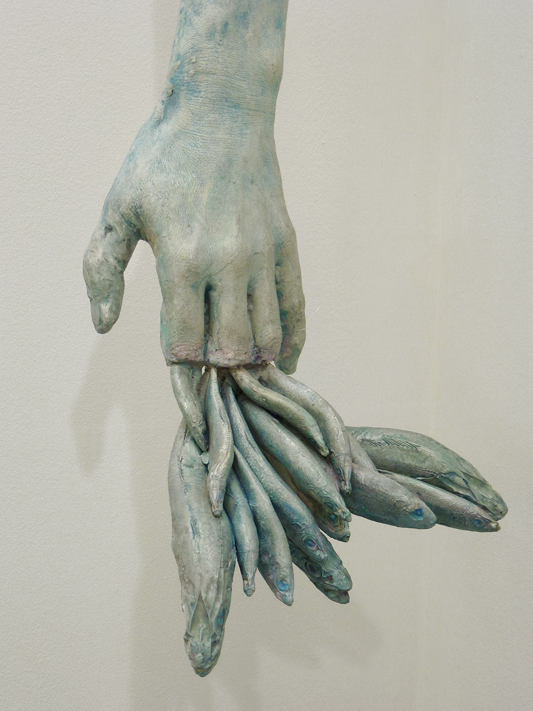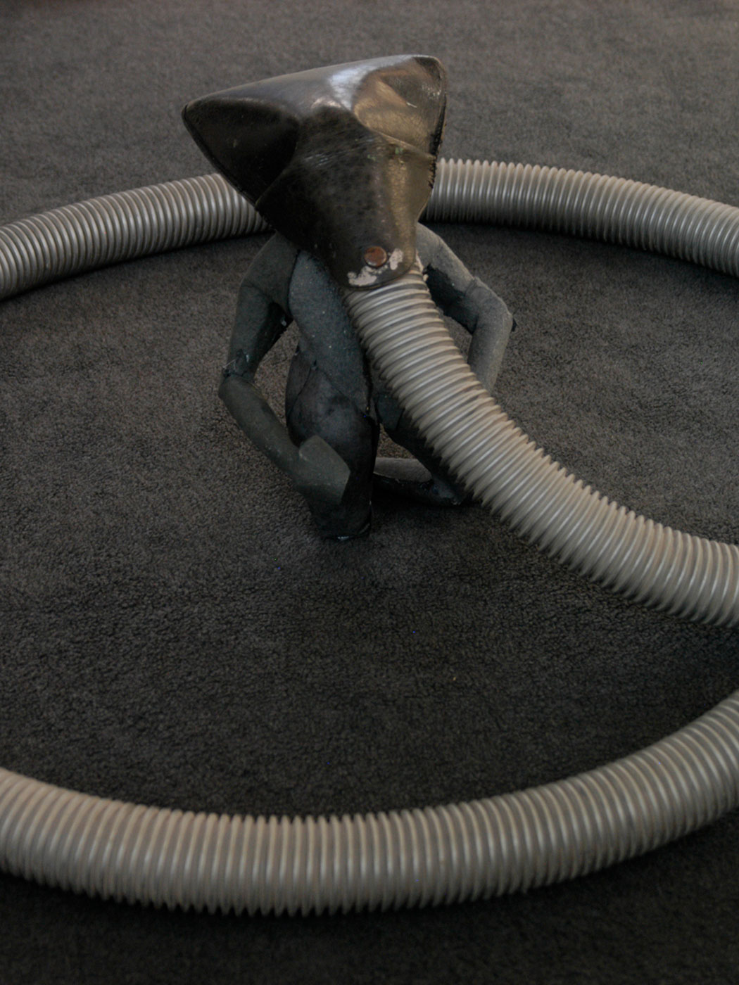 She welcomes me inside, out of the chucking spring rain and into her unpretentious studio. She’s recently transformed the space, ripping out the old carpeting, applying a coat of white emulsion to the walls and frequenting eBay to sell the needless items that had been stored in here. Only an unsold unemployed glass shower door remains leaning against one wall. Blackened wooden floorboards are splattered with paint and clay dust. Five head-shaped figures wrapped in plastic bags of various colours – works in progress – sit on a table next to the storage bins overflowing with sculpting supplies. There is a radio on the mantle next to one of Marianne’s earlier pieces representing the legend of Sedna, the Inuit sea goddess whose fingers begat ocean creatures. In the centre of the room, her stage: a swivelling platform atop which sits an upright dowel – a wooden stick – with a paper ball on top, all wrapped in plastic. That will be the root of me, I presume.