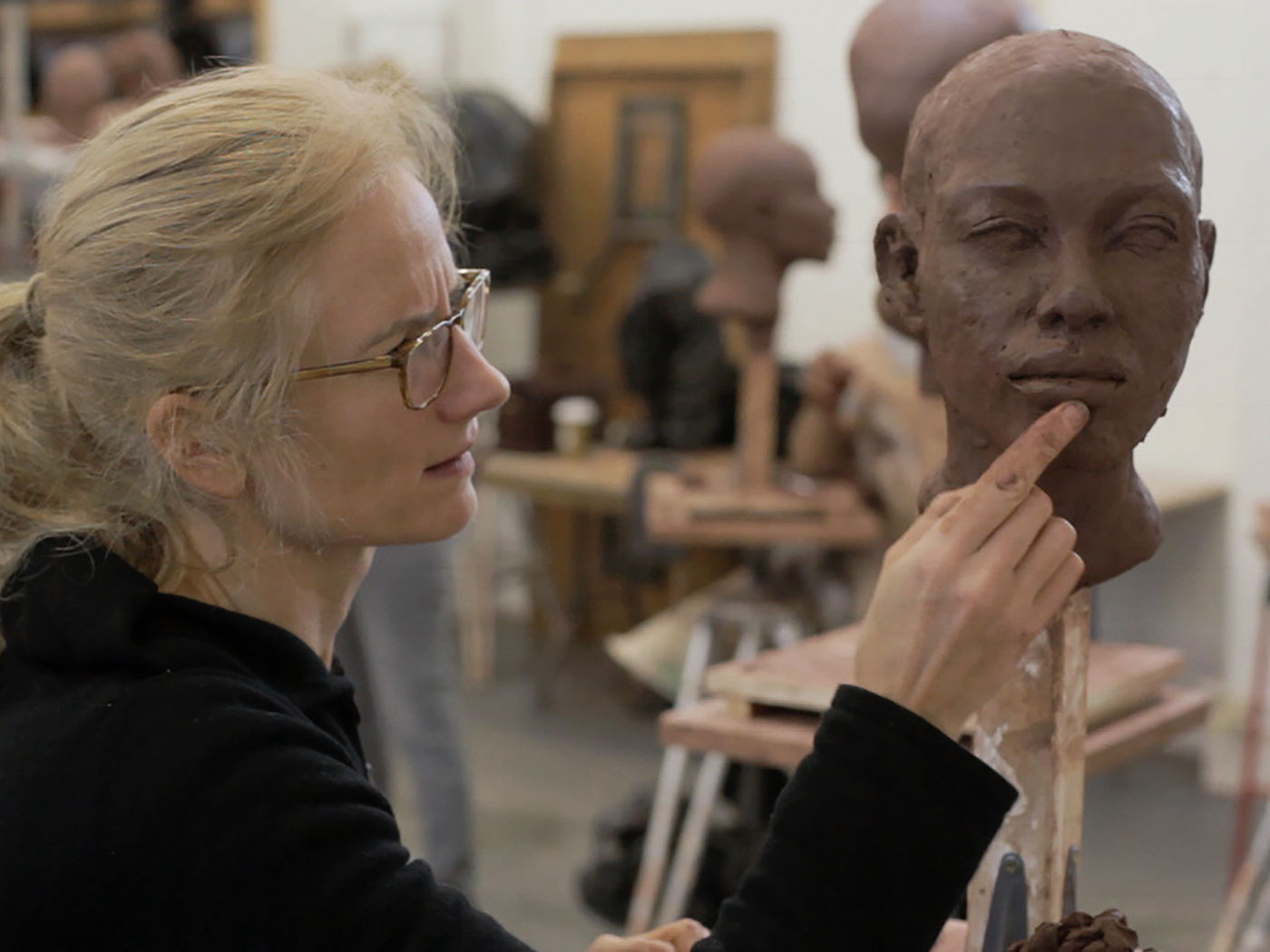 She wastes no time getting started, grabbing handfuls of terracotta clay and applying it to her small scaffold. She’s rolled up her sleeves and tied her hair back but disobedient blonde wisps explode from Marianne’s head like capering flames. Working quickly, her fingers dance in the clay that glows darkly against her pale skin. She is at one with the material.