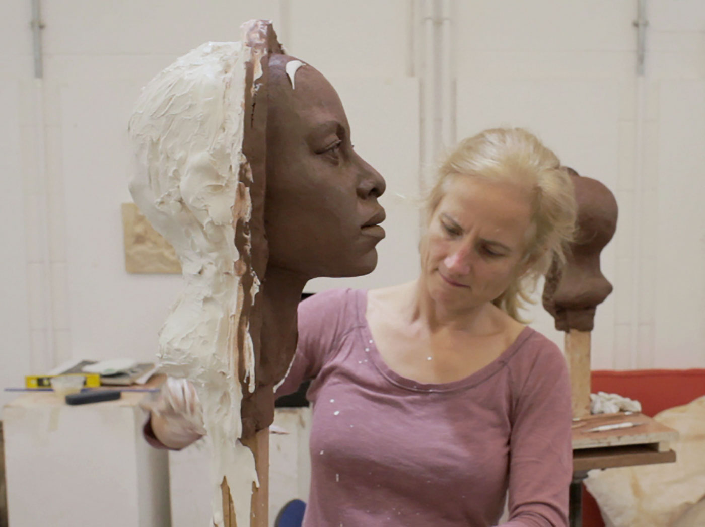 When we meet up in her studio a week later I’m anxious to see if what Marianne has crafted is as I’d remembered and if it will feel as meaningful as it had a week earlier. She carefully unwraps the plastic dressing that has kept the clay supple and I can already recognise the shape of my head, the lips, the forehead. She’s even captured the curious flat plateau at the back of my skull.